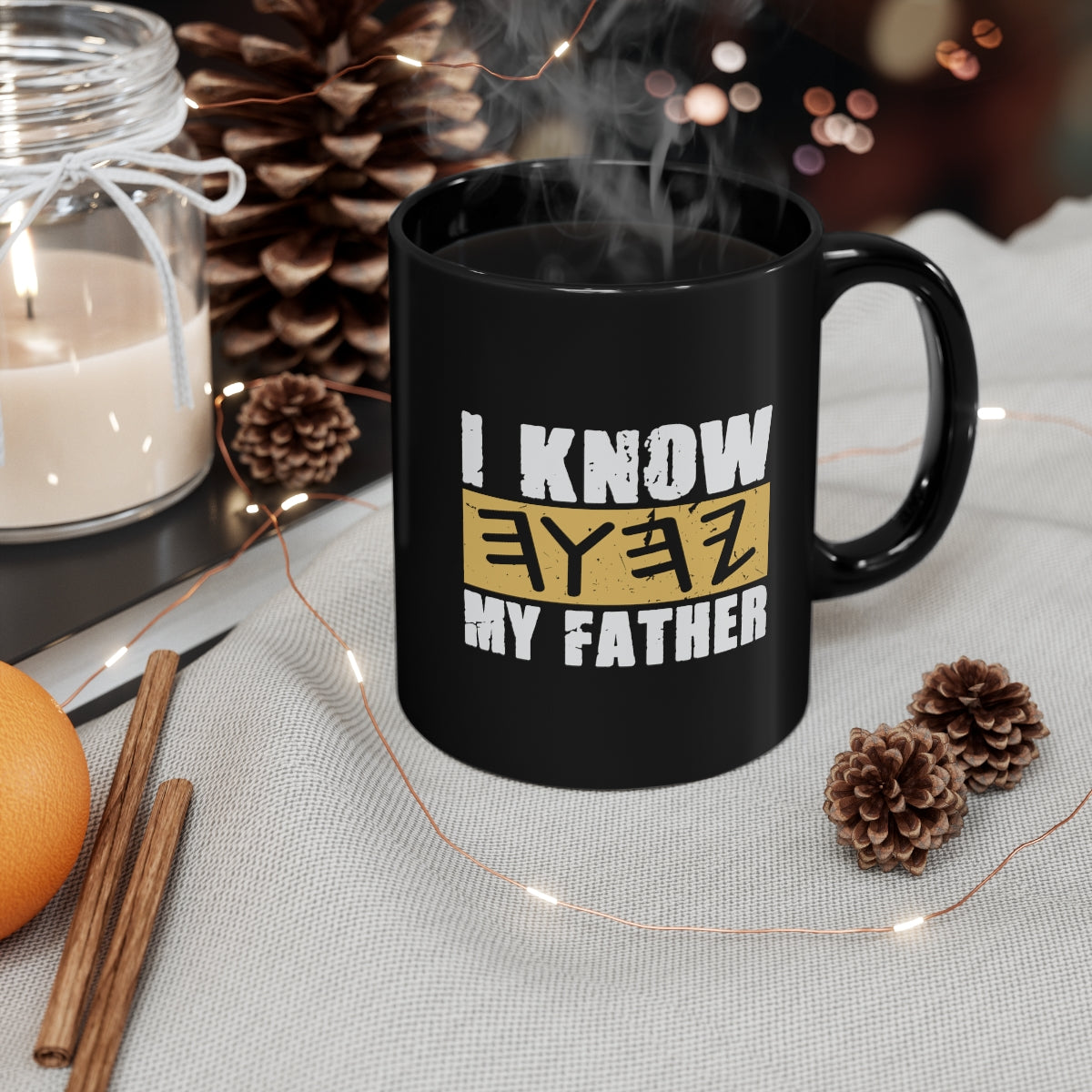 Elevate your soul with our Black Ceramic Mug, featuring the powerful affirmation "I KNOW MY FATHER - I CALL HIM YAHUWAH." This perfectly sized mug is not only a vessel for your favorite coffee or tea but also a statement of faith.