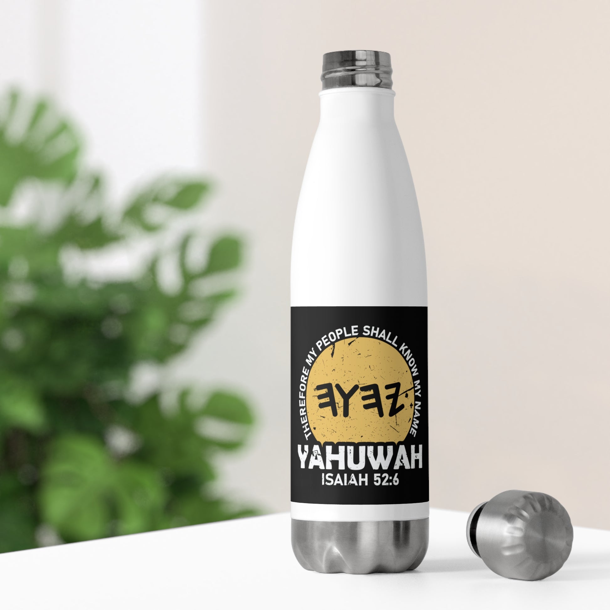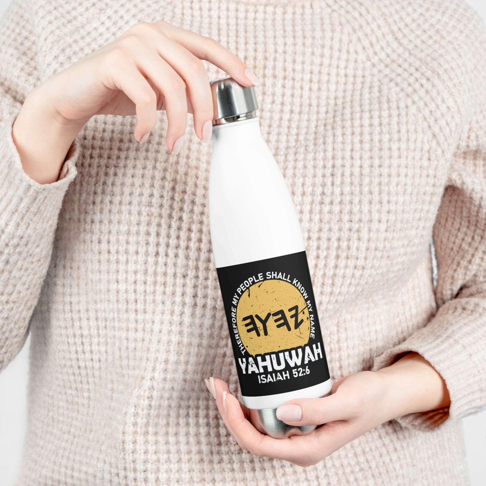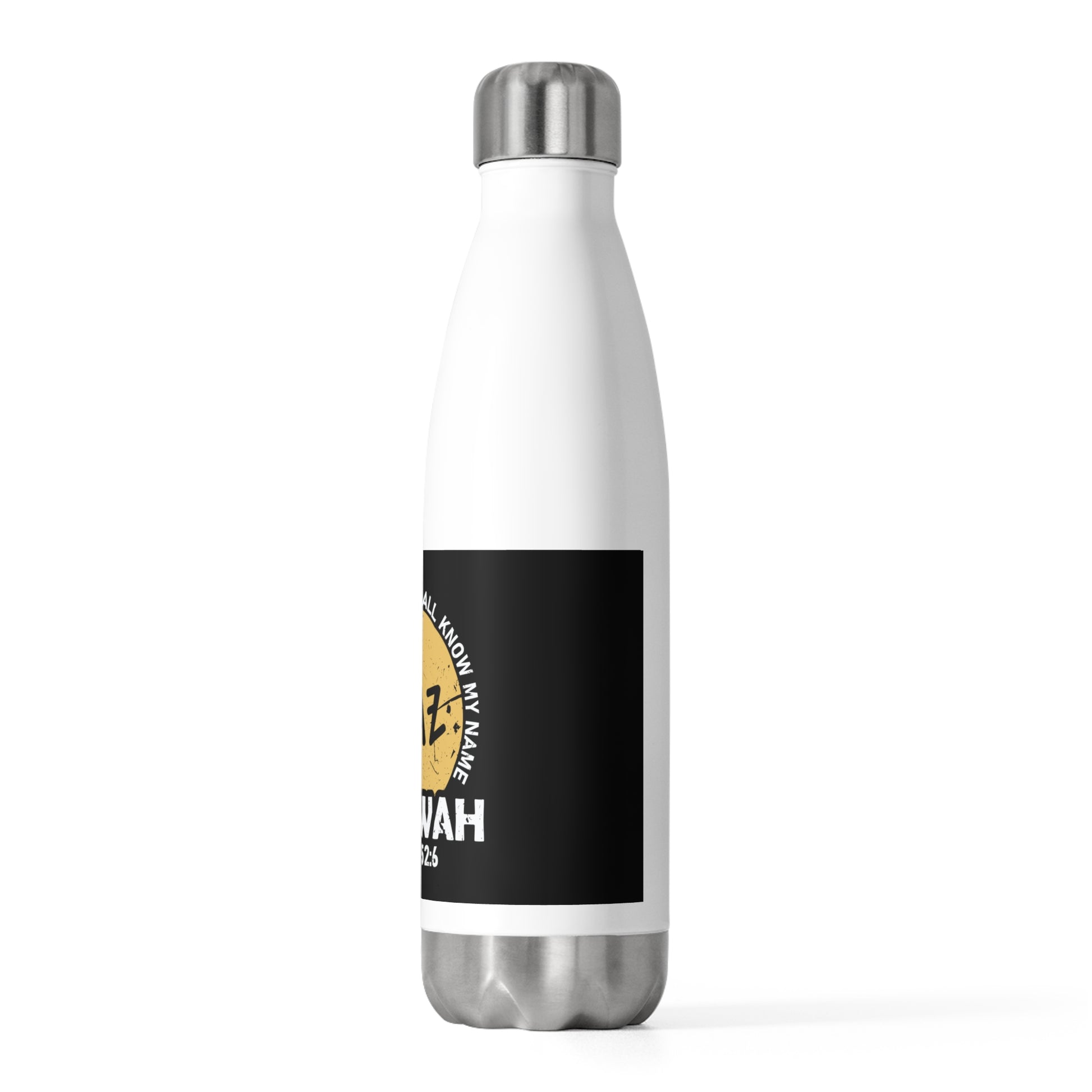 Introducing our 20 oz Stainless Steel Water Bottle, featuring the inspiring scripture, "Therefore My People Shall Know My Name - Isaiah 52:6." Crafted for your daily adventures, this double-walled bottle keeps your beverage hot or cold for hours on end. Its odor- and leak-proof cap ensures mess-free hydration wherever you go.