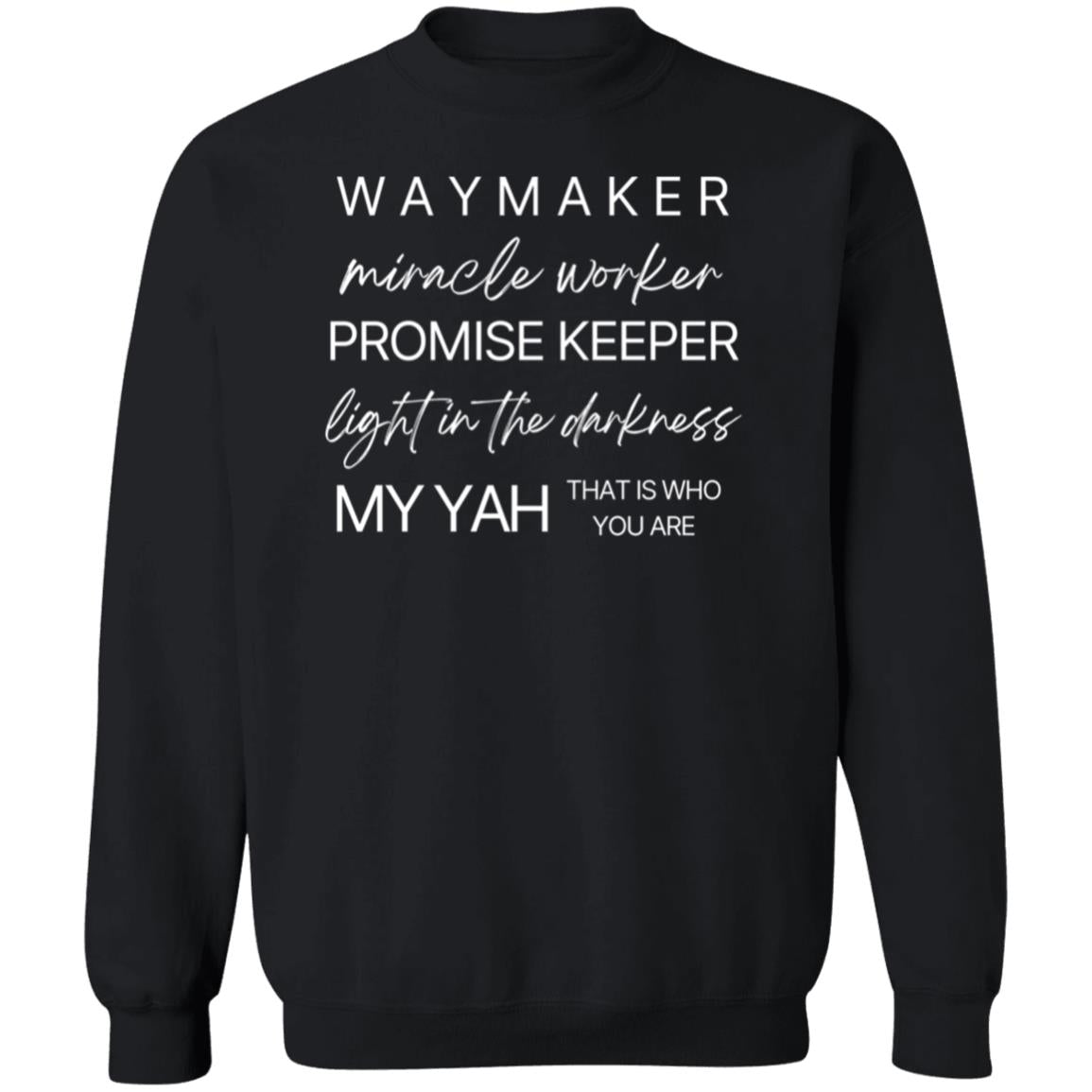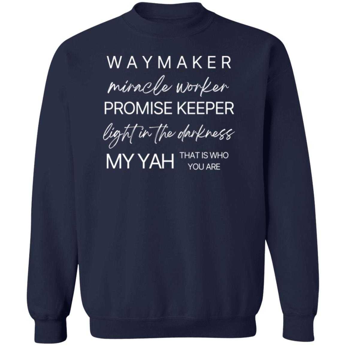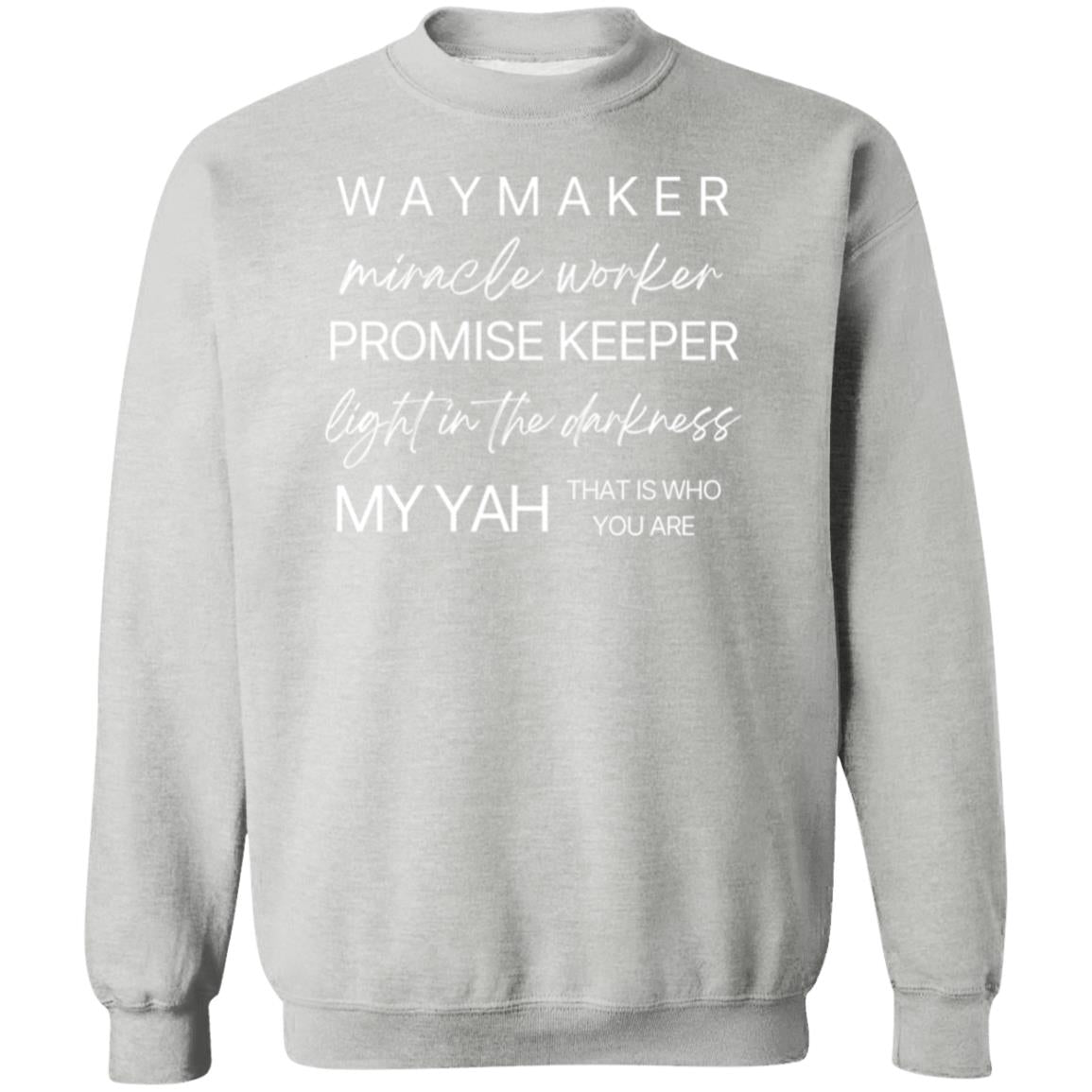 Introducing our Crewneck Pullover Sweatshirt, adorned with an uplifting message that resonates with the soul. Emblazoned at the front is the empowering declaration: "WAYMAKER, miracle worker, PROMISE KEEPER, light in the darkness, MY YAH that is who you are."