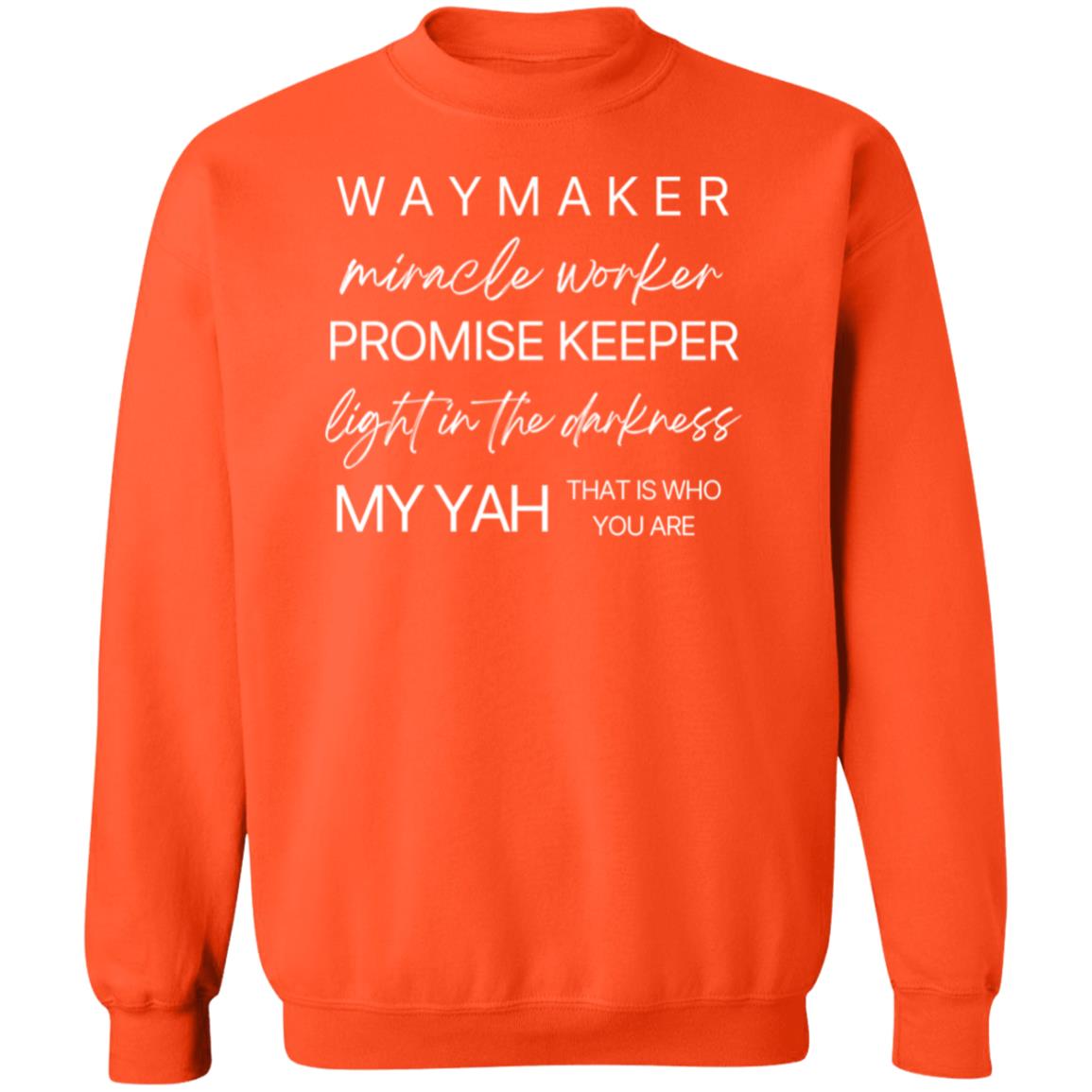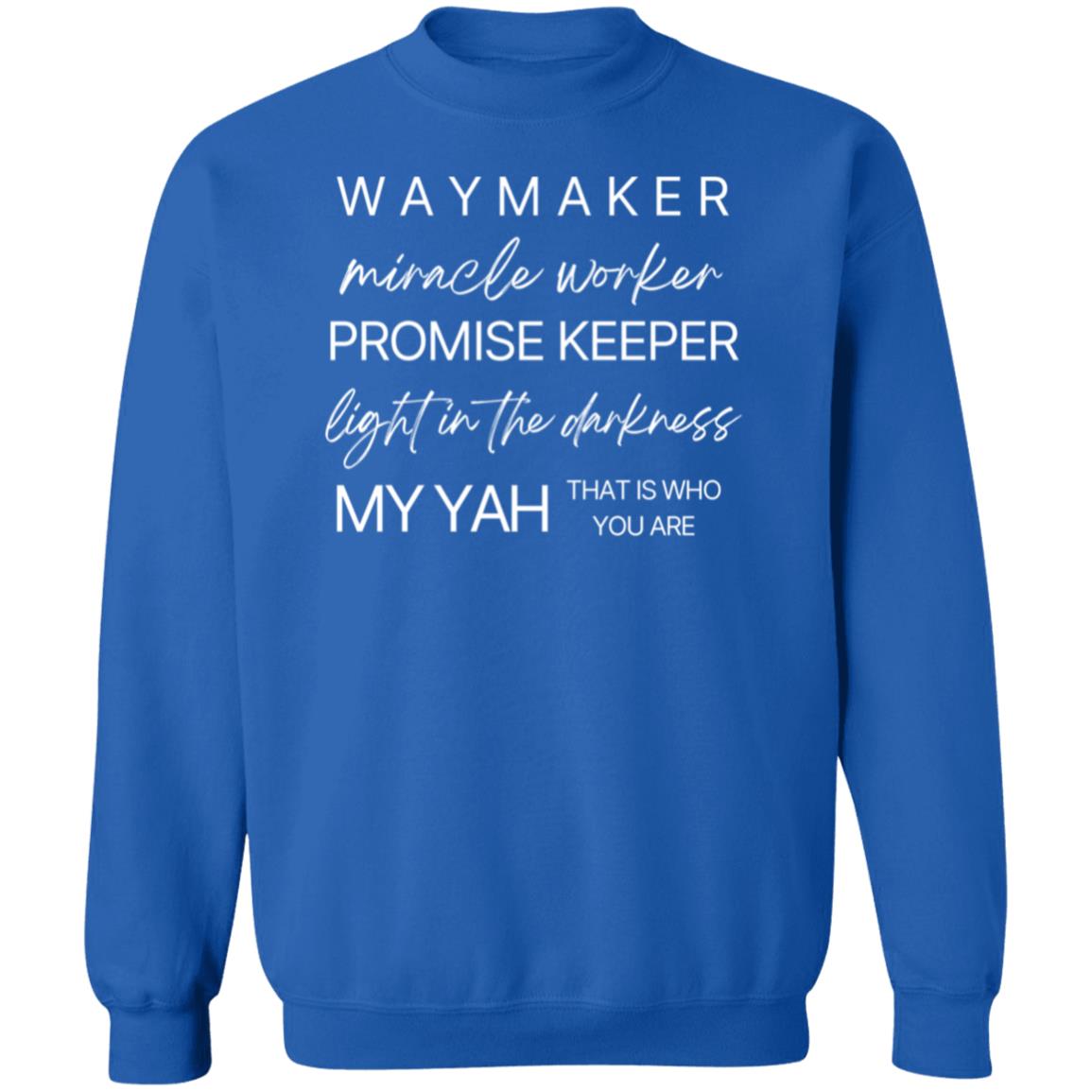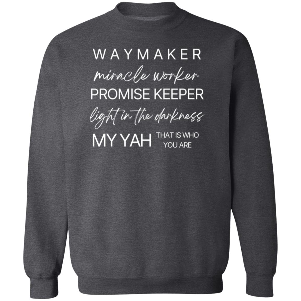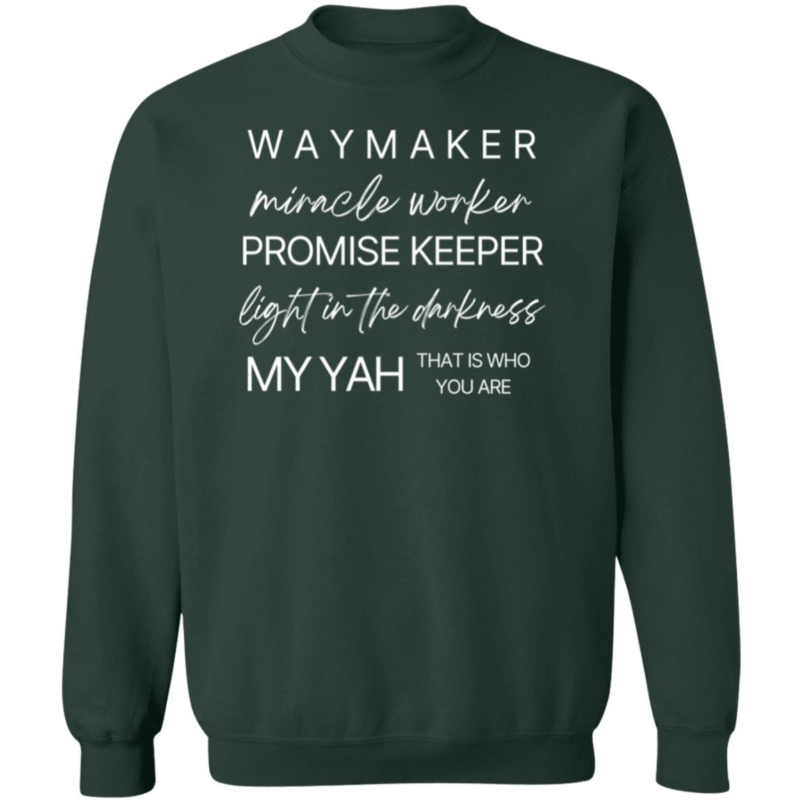 Introducing our Crewneck Pullover Sweatshirt, adorned with an uplifting message that resonates with the soul. Emblazoned at the front is the empowering declaration: "WAYMAKER, miracle worker, PROMISE KEEPER, light in the darkness, MY YAH that is who you are."