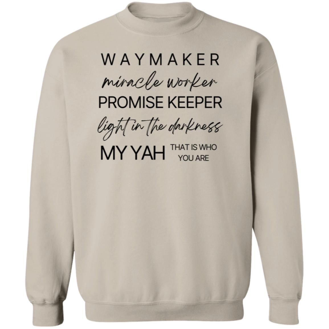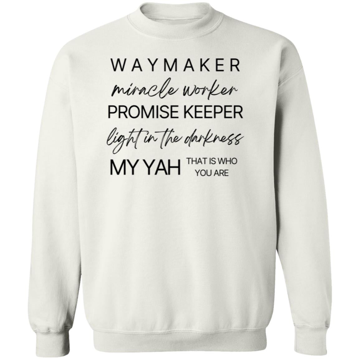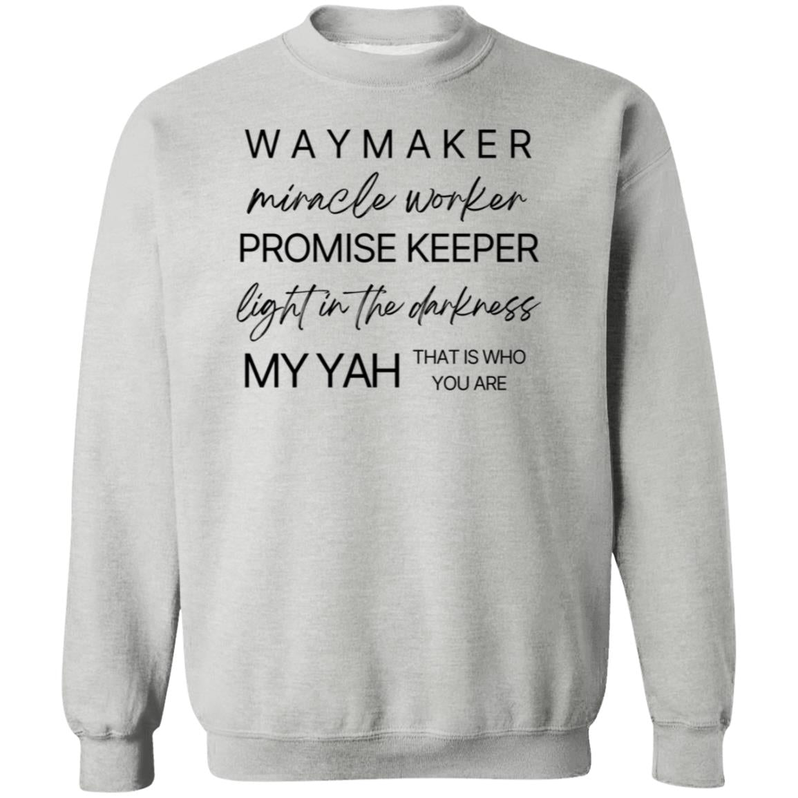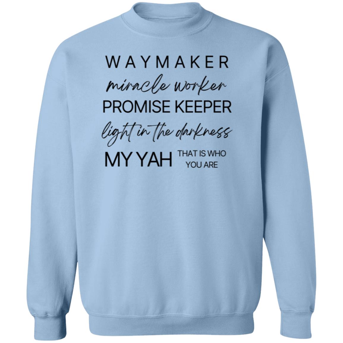 Emblazoned with the uplifting message "Waymaker, Miracle Worker, Promise Keeper, Light in the Darkness, My Yah That is Who You Are" at the front, our sweatshirt is more than just clothing; it's a declaration of faith and gratitude.