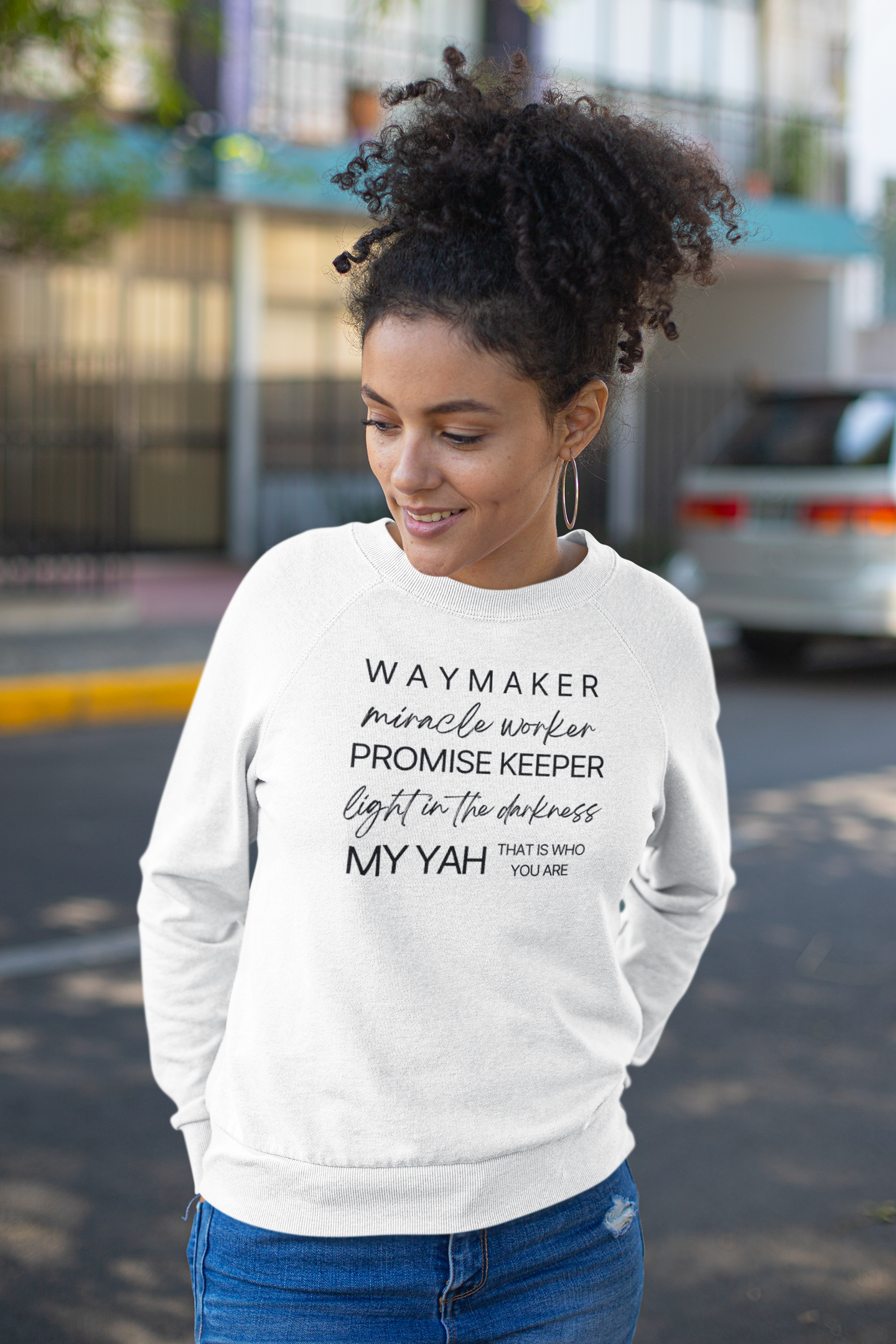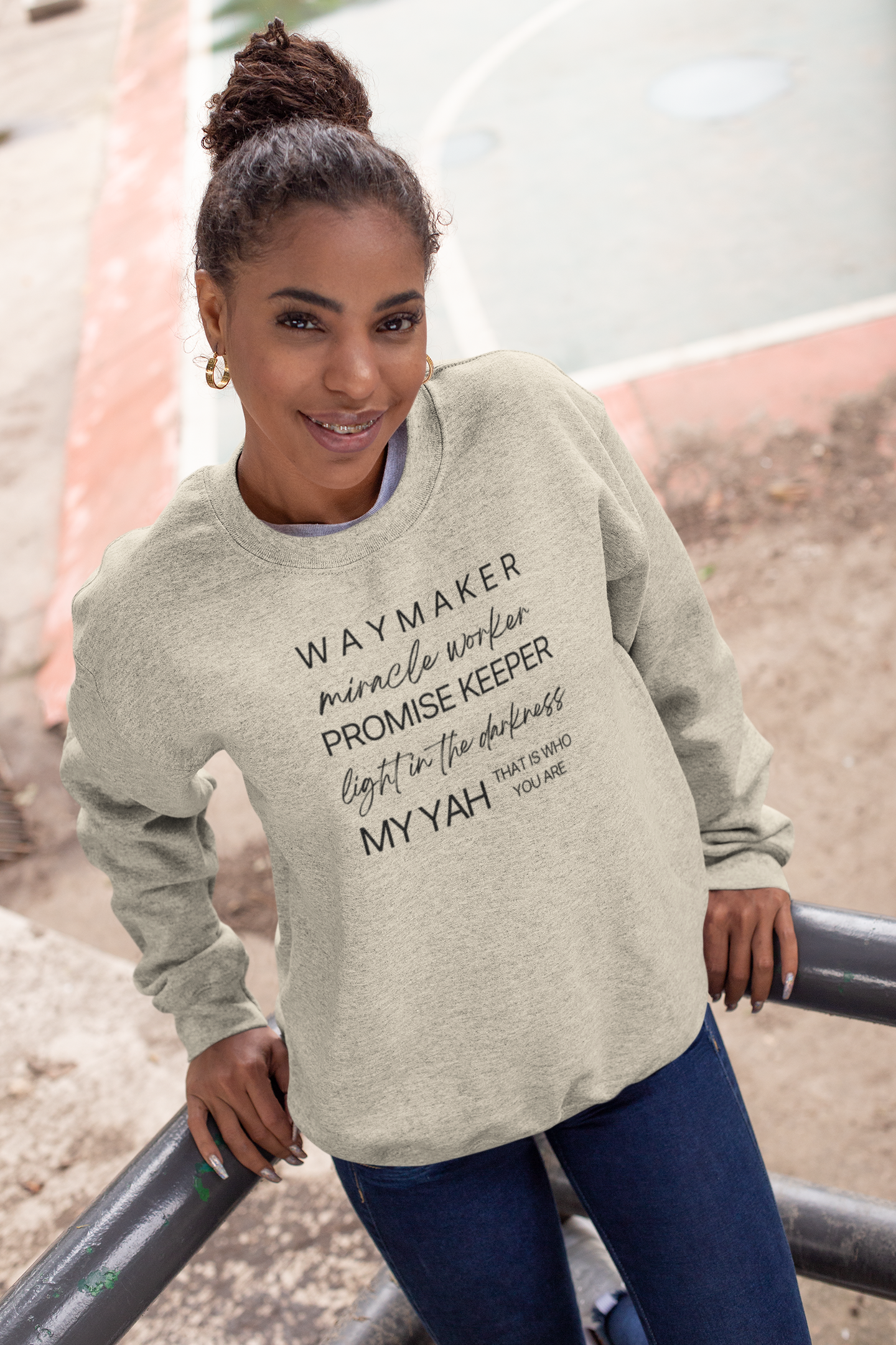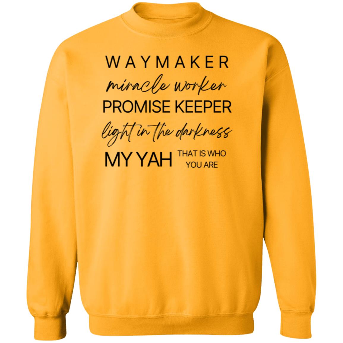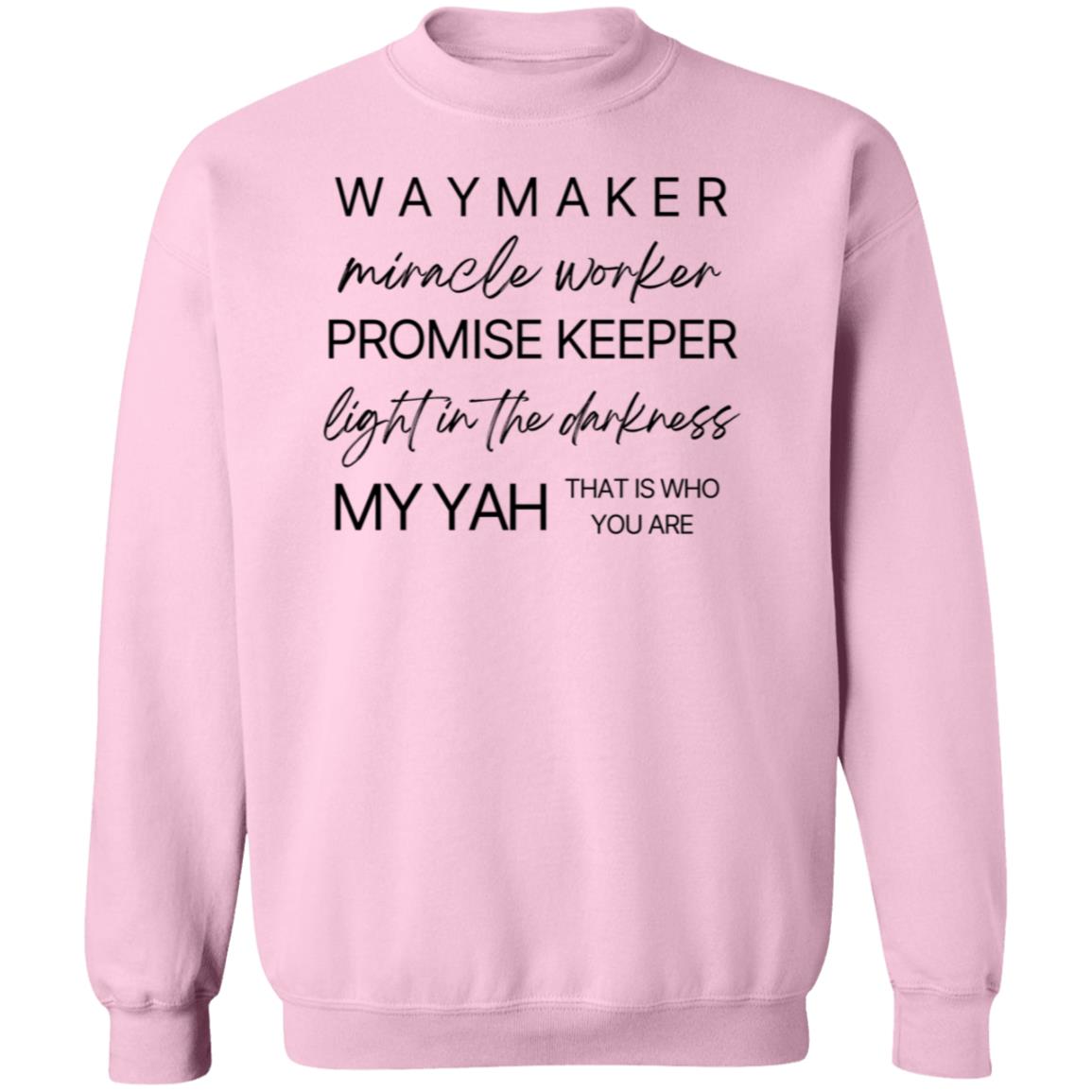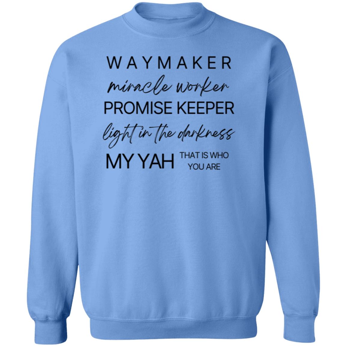 Emblazoned with the uplifting message "Waymaker, Miracle Worker, Promise Keeper, Light in the Darkness, My Yah That is Who You Are" at the front, our sweatshirt is more than just clothing; it's a declaration of faith and gratitude.