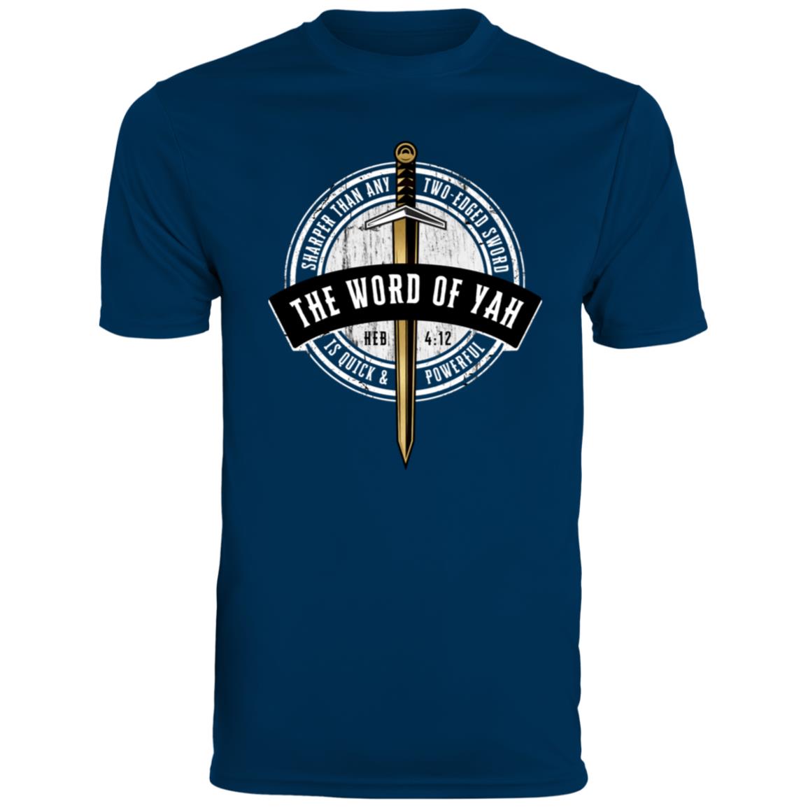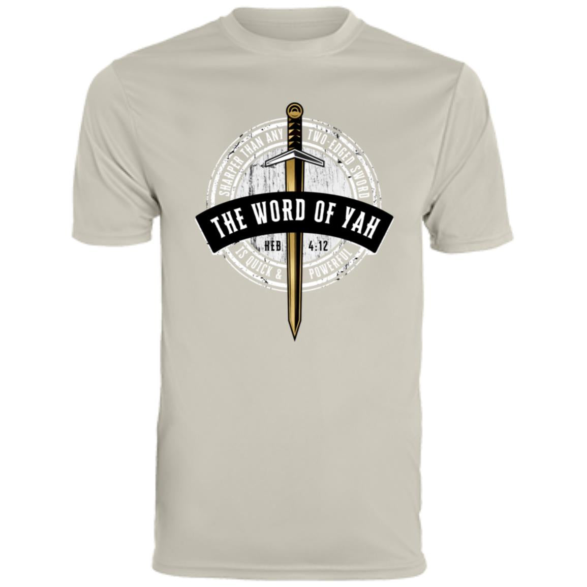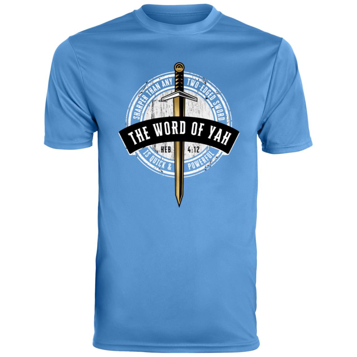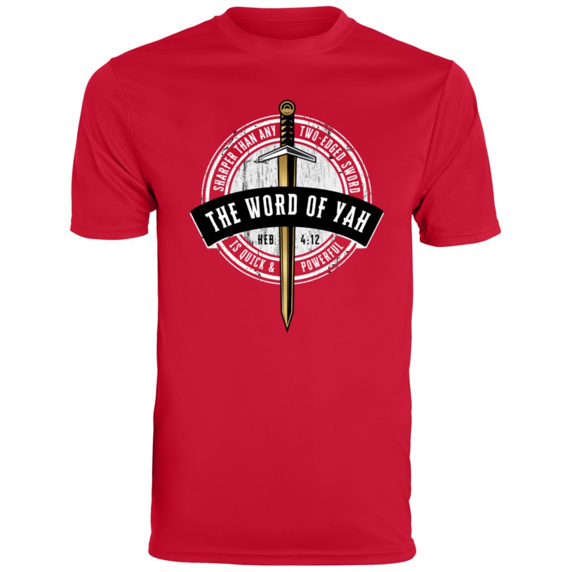 Stay cool and showcase your faith with our Men's Moisture-Wicking T-shirt, featuring the powerful message "Sharper Than Any Two-Edged Sword, The Word Of Yah is Quick And Powerful - Hebrew 4:12" on the front. Made from 3.7 oz, 100% polyester, this T-shirt offers ultra-breathable, moisture-wicking fabric that keeps you dry and comfortable during any activity.