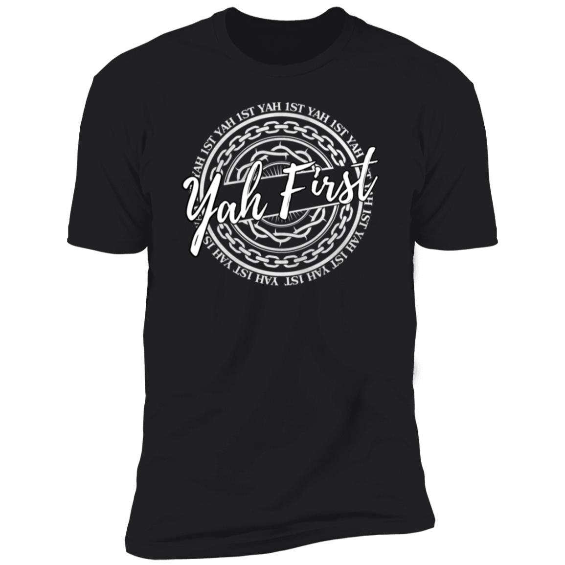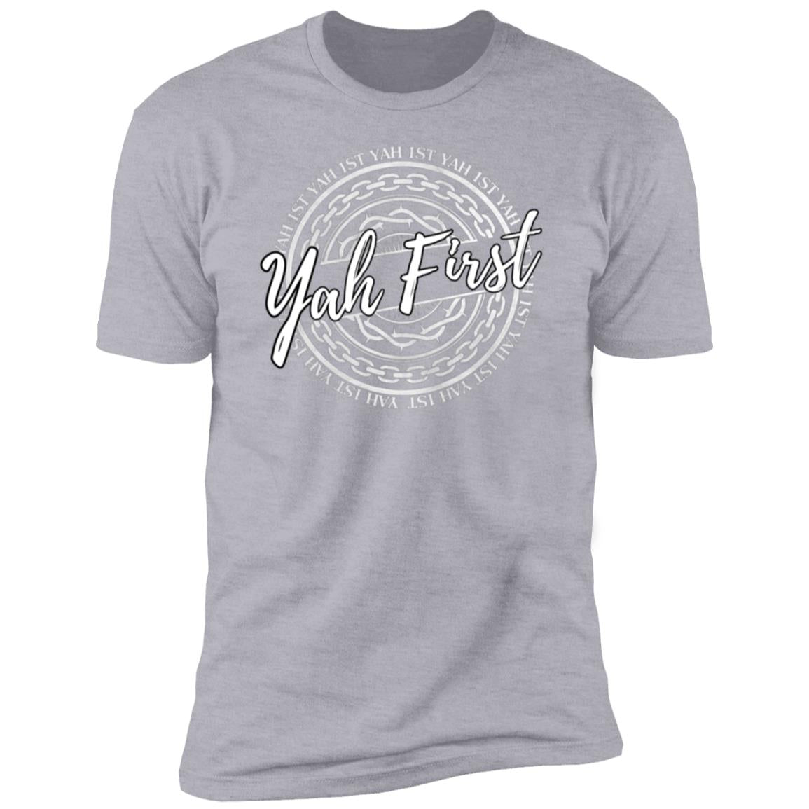 Enhance your casual wardrobe with our Men's Premium Short Sleeve T-shirt, featuring the impactful "Yah First" message in crisp white letters on the front. Crafted from 4.3 oz, 100% ring-spun combed cotton jersey, this T-shirt ensures unmatched softness and comfort. The Heather Gray variant includes a blend of 90% cotton and 10% polyester for added resilience.